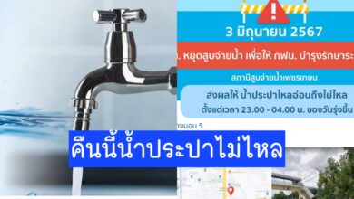 การประปานครหลวงแจ้งน้ำประปาไหลอ่อน-น้ำไม่ไหล 2 พื้นที่ ในคืนนี้ 3 มิถุนายน 67 ถึงรุ่งเช้า เช็กที่ไหนกระทบบ้าง การประปานครหลวง (กปน) ประกาศหยุดจ่ายน้ำในบางพื้นที่ในวันที่ 3 มิถุนายน 2567 ทำให้ในบางพื้น