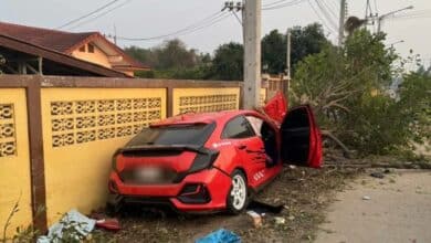 รถเก๋งแข่งกระบะ เสียหลัก ชนยายรอใส่บาตรเสียชีวิต ก่อนขนของหนี