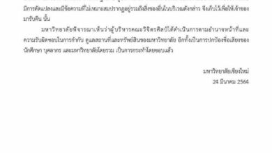 มหาวิทยาลัยเชียงใหม่ ร่อนแถลงการณ์ ปกป้องคณะบดีวิจิตรศิลป์ เจ้าหน้าที่ หลังดราม่า#ทีมมช เหตุเก็บงานศิลปะนศ. เป็นกระทำโดยชอบแล้ว จากกรณีดราม่าในวงการศิลปะ เมื่อเกิดเหตุนักศึกษาจัดแสดงผลงานศิลปะสะท้อนสั