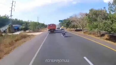 อย่าหาทำ! มอเตอร์ไซค์ย้อนศร แทรกรถบรรทุกกลางถนน