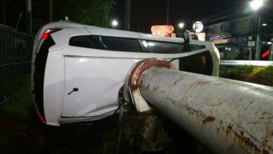 ฝนตกถนนลื่นรถเก๋งเสียหลักผลิกคว่ำชนคอสะพาน ถนนเจ้าฟ้าตะวันออก