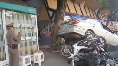 หนุ่มใหญ่ลมชักกำเริบ ถอยเก๋งพุ่งอัดมอเตอร์ไซค์ พังยับ
