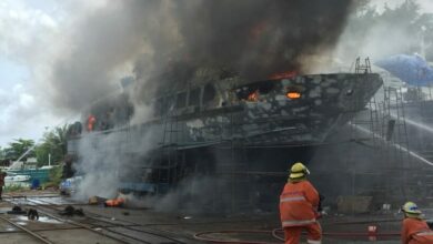 เพลิงไหม้เรือท่องเที่ยวอยู่ระหว่างขึ้นคานวอดทั้งลำ