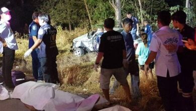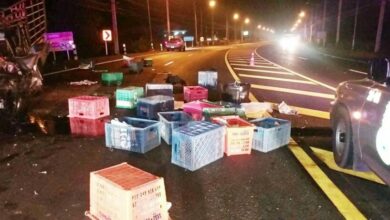 ตำรวจหญิงขับเก๋งชนกระบะขนผลไม้ ลังเกลื่อนถนน ดับ 2 ศพ