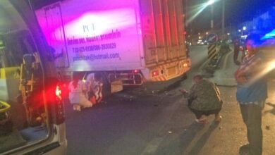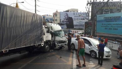 ภาพ: มูลนิธิกุศลธรรม ภูเก็ต – รถบรรทุก 6 ล้อลงเขาป่าตองเบรกขัดข้องพุ่งชนประสานงานรถบรรทุก 6 ล้อส่งผ้า และชนรถยนต์ รถจักรยานยนต์ประมาณ 7 คัน มีผู้บาดเจ็บประมาณ 5 คน เมื่อเวลา 17.00 น.วันที่ 22 ม.